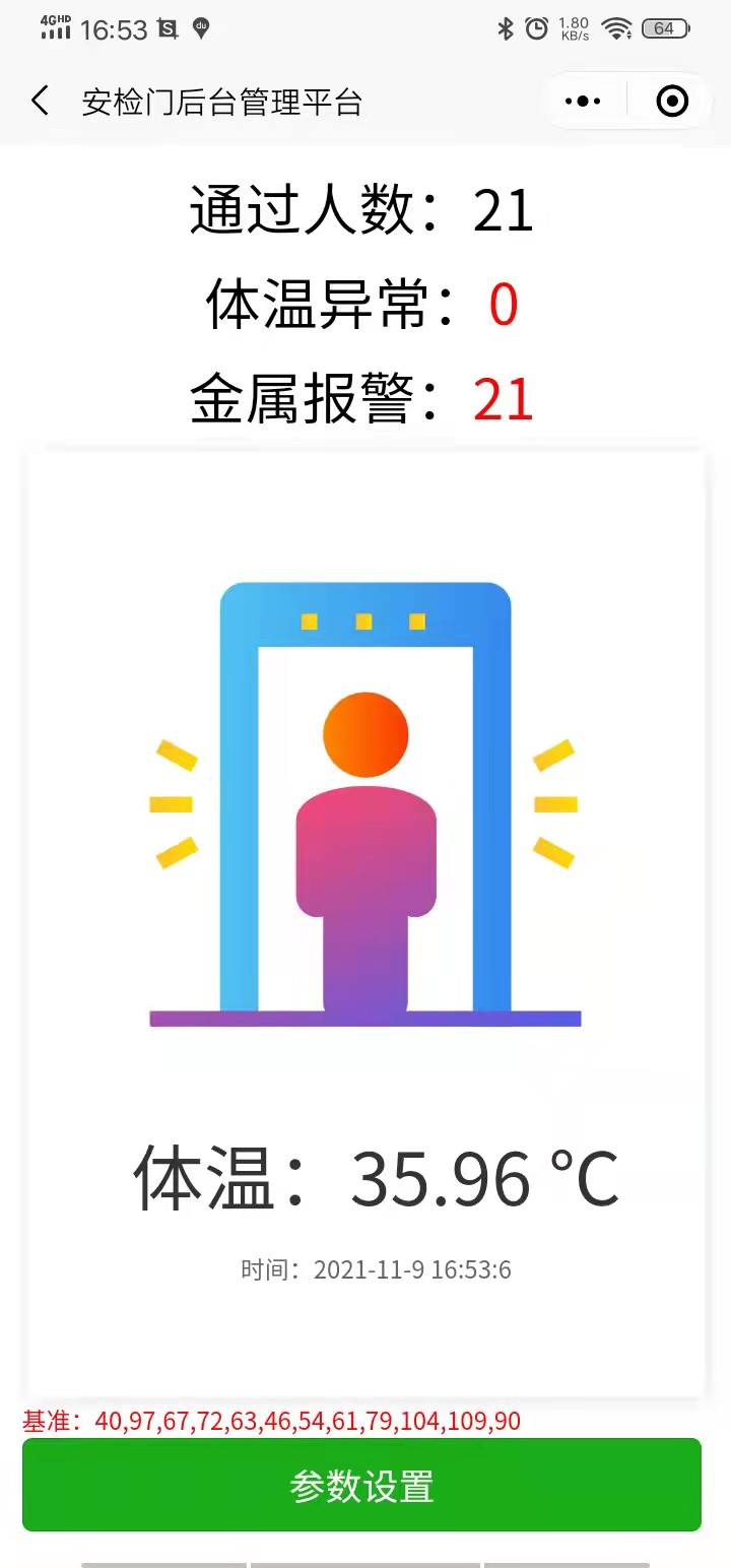 設(shè)備可通過(guò)打開(kāi)手機(jī)藍(lán)牙,使用專用微信小程序搜索“安檢平臺(tái)”實(shí)時(shí)查看當(dāng)前檢測(cè)信息,包含金屬報(bào)警信息,溫度檢測(cè)數(shù)據(jù)等,也可通過(guò)手機(jī)小程序?qū)υO(shè)備參數(shù)進(jìn)行設(shè)置,包括設(shè)置金屬檢測(cè)靈敏度,實(shí)時(shí)查看當(dāng)前檢測(cè)信息,包含金屬報(bào)警信息,溫度檢測(cè)數(shù)據(jù)等;連接界面如下: