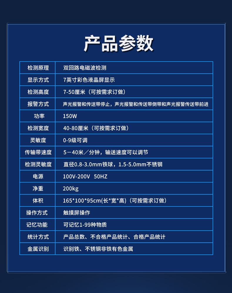 6、檢測靈敏度:直徑0.8-3.0mm鐵球,1.5-5.0mm不銹鋼(探測精度與機器的高度和寬度有直接關(guān)系,通常高度越高,寬度越寬,機器的探測精度越低,反之,相反。)