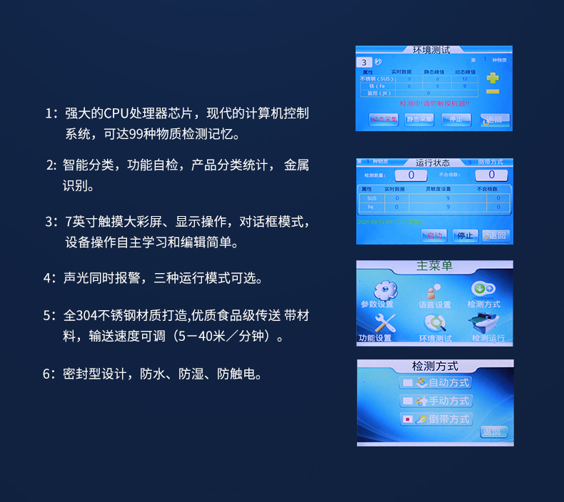 新品上市!MCD-F500QF食品安全金屬檢測用!特別適用于水分、鹽分過高的食品安全檢查,也用于檢查目前行業(yè)里面不能檢查的鋁箔包裝的食品安檢。本型號是美創(chuàng)達誠安檢設(shè)備有限公司根據(jù)多年從事金屬探測儀研制開發(fā)生產(chǎn)的基礎(chǔ)之上,推出新一代微電腦智能型高靈敏度,高可靠性觸摸屏界面金屬檢測儀,產(chǎn)品采用雙回路電路設(shè)計,性能更穩(wěn)定。新型7寸超大全彩色液晶觸摸屏,雙語菜單設(shè)計,操作更方便、更人性化。此為全金屬檢測儀器,可檢測鐵和非鐵等金屬,靈敏度可分別調(diào)節(jié),帶記憶功能可預(yù)設(shè)6種檢測物質(zhì),對帶水份的產(chǎn)品及冰凍產(chǎn)品有很好的排除性,突破大部分設(shè)備只對磁性物質(zhì)反應(yīng)靈敏的技術(shù)瓶頸,檢測儀采用聲光報警,同時自動排除、停機、、倒帶功能,人性化菜單,觸摸屏操作方便,整機采用不銹鋼材料,防腐蝕、不生銹、易清洗。因此廣泛應(yīng)用于食品、藥品、玩具等要求高的物體里的金屬的檢測。其特點及操作介紹如下: