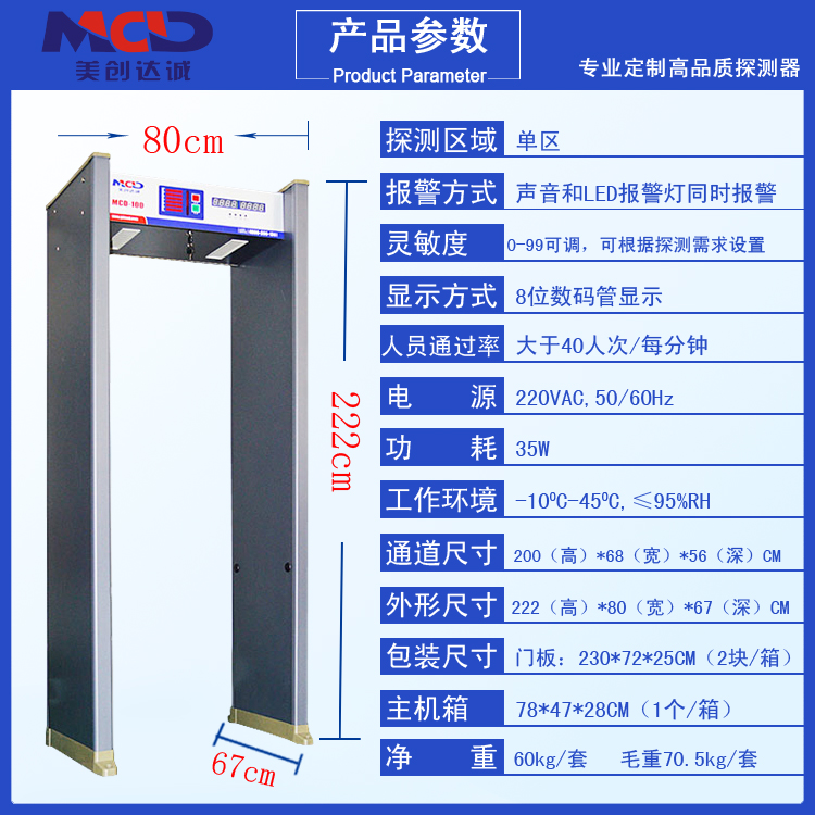 MCD—500安檢門三防設計:防火、防水、防震設計:采用進口防火板為門板材料,有防火、防水、防震、