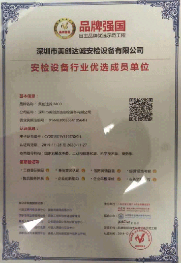 2019年11月28日,深圳市美創達誠安檢設備有限公司旗下品牌“美創達誠 MCD”經過資質審核、信用輿情督查、專家委員會評審、社會公示等數十項評審后,順利入選品牌強國示范工程【安檢設備】行業優選成員單位。