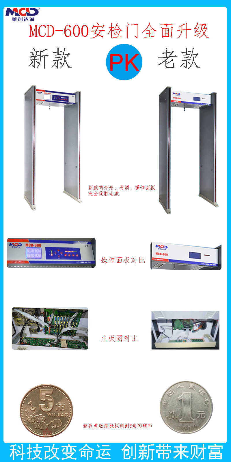 熱烈祝賀我司產(chǎn)品安檢門系列中的MCD-600重大突破和改進,新款MCD-600安檢門無論是在外觀、主板路線結(jié)構(gòu)都有改進,更不可思議的是探測靈敏度能成功探測到細微金屬,如:五角硬幣。