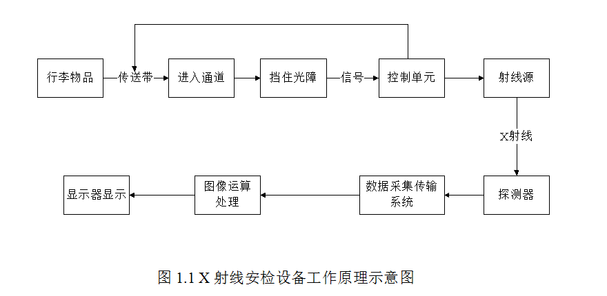 物品進(jìn)入通道后,檢測裝置將相關(guān)信息送至控制單元,由控制單元觸發(fā)X射線源發(fā)射X射線。X射線經(jīng)過準(zhǔn)直器后形成非常窄的扇形射線束,穿透傳送帶上的行李物品落到探測器上,探測器把接收到的X射線變?yōu)殡娦盘枺@些很弱的電流信號被放大后量化,通過通用串行總線傳送到工業(yè)控制計(jì)算機(jī)作進(jìn)一步處理,經(jīng)過復(fù)雜的運(yùn)算和成像處理后得到高質(zhì)量的圖像。其工作原理如圖1.1所示: