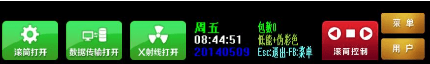 此方法針對安檢人員在操作安檢機的時候所做說明,如圖一所示,我們可以直觀地了解到當前滾筒運動狀態、數據連接是否正常,射線是否打開等信息,同時,顯示界面還提供了滾筒控制按鈕,當點擊按鈕或時,滾筒正常運行或反方向運行,當按鈕時,滾筒停止運行。